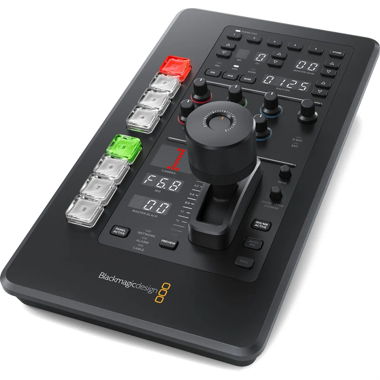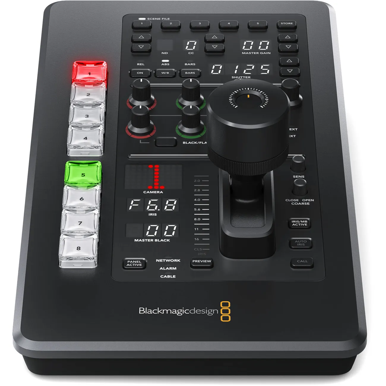 Hlavním ovládacím prvkem pro ovládání kamer je profesionální joystick pro přesné nastavení clony při pohybu nahoru a dolů a hlavní černé při otáčení knoflíku. Jedná se o stejný typ ovládání, jaký se používá na řídicích jednotkách broadcastových kamer, takže získáte skutečně profesionální uživatelské rozhraní. Nechybí ani tlačítko pro volání pro komunikaci s operátorem kamery, spolu s tlačítkem uzamčení panelu a indikátory pro připojení ke kameře sítí, napájením a kabelem.