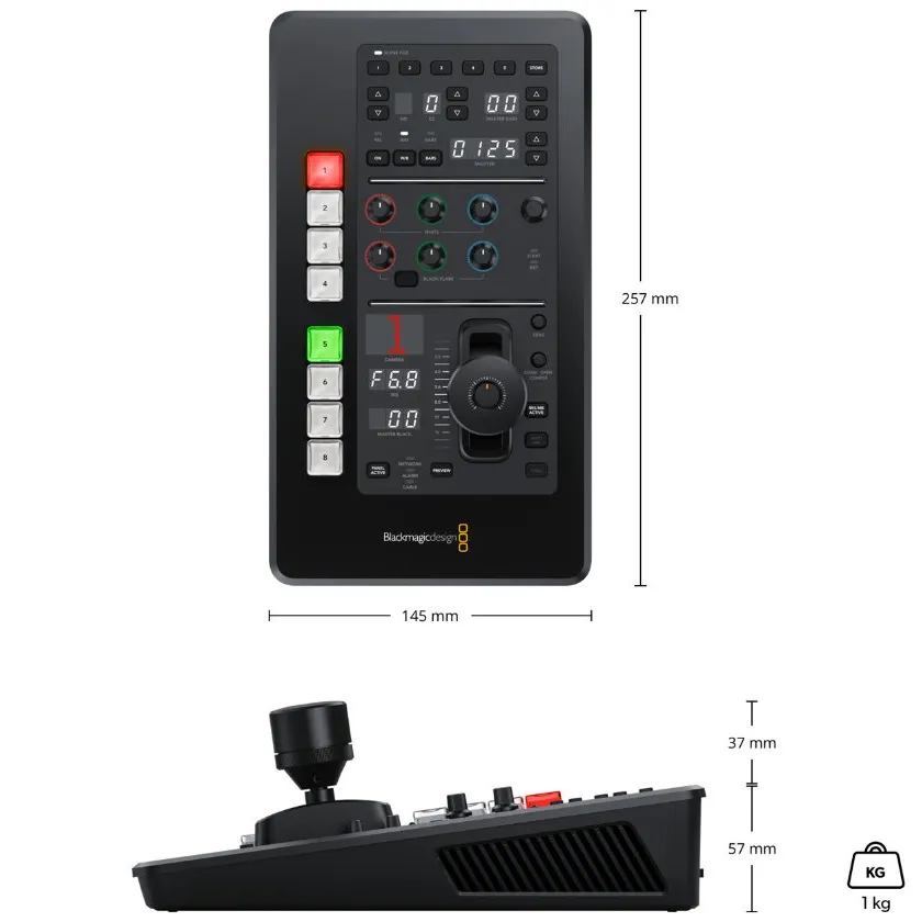 Přenosný kompaktní kamerový panel ATEM Micro Camera Panel se špičkovými ovládacími prvky CCU pro vysílání, včetně vestavěné baterie, Bluetooth a 8 tlačítek pro výběr kamery, pro clonu, závěrku, vyvážení bílé, hlavní gain, vyvážení RGB a další funkce až pro 8 kamer z jediného panelu. Připojuje se k softwarovému ovládání ATEM prostřednictvím rozhraní Bluetooth nebo USB-C.