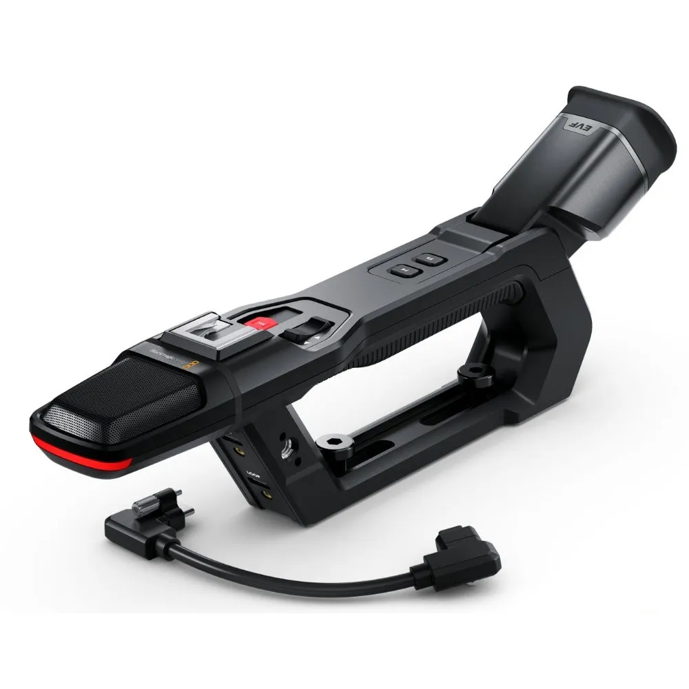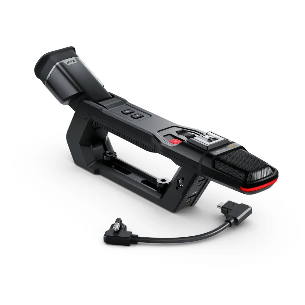 Blackmagic PYXIS Pro Handle obsahuje integrovaný HD OLED hledáček, stereo mikrofon, tlačítko pro spuštění/zastavení záznamu a programovatelná funkční tlačítka.